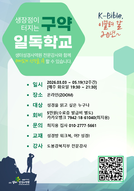 [도봉강북지부] 구약성경방 일반 2026년 3월 3일~ 5월 19일(12주) 매주 화요일 저녁 7:30 ~ 9시30분